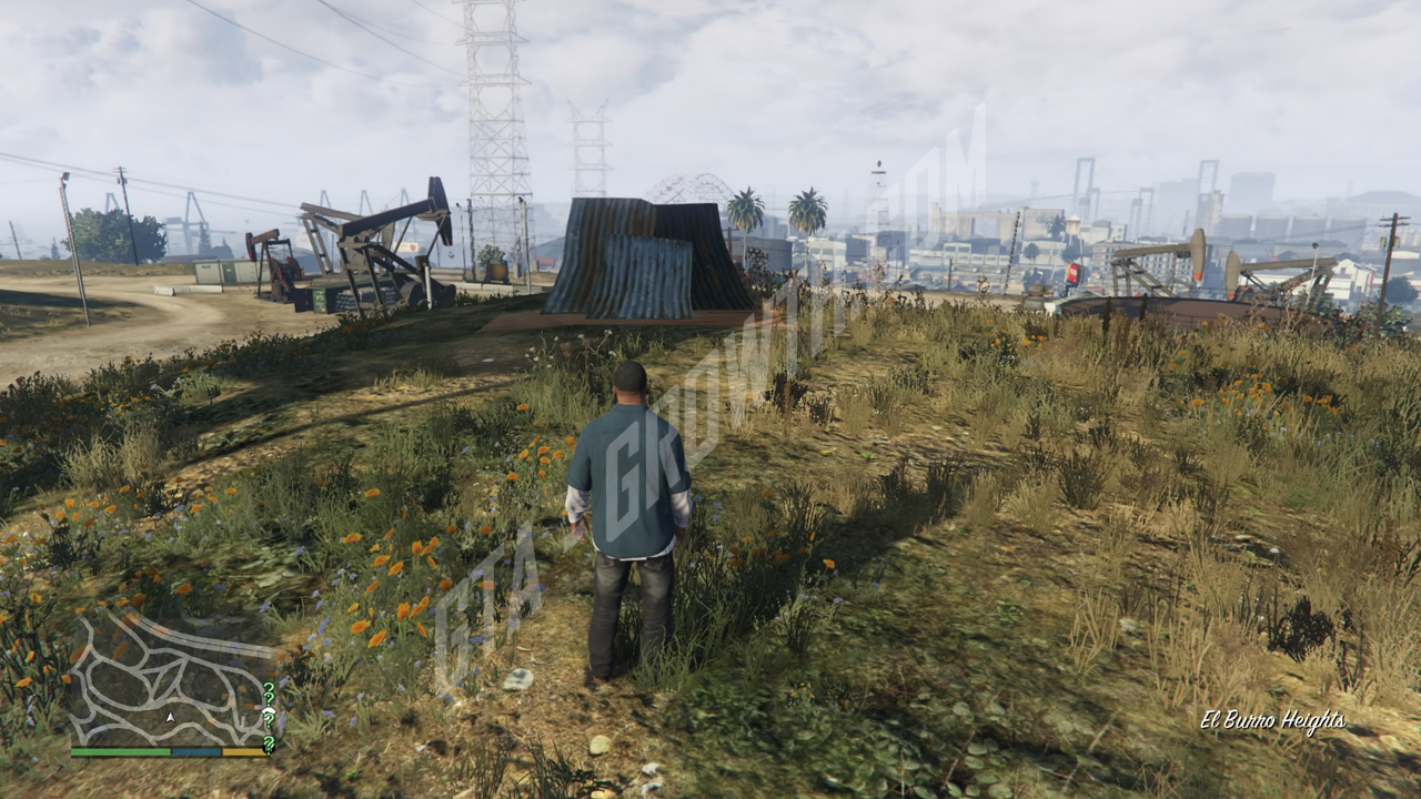 9. Para concretar este salto es necesario comenzar a acelerar a una gran distancia para poder alcanzar la altura requerida. Busca unas palmeras junto a la calle sobre la que debes aterrizar al realizar el salto Nº 6 y posiciónate unos metros más al norte, cerca de las vías del tren que van en dirección oeste-este. A partir de allí, dirígete hacia el sur y utiliza la habilitad de Franklin en las dos curvas (primero hacia la derecha y luego hacia la izquierda) para mantener la velocidad y el control de la dirección. El objetivo es caer sobre el tejado del depósito más largo. |