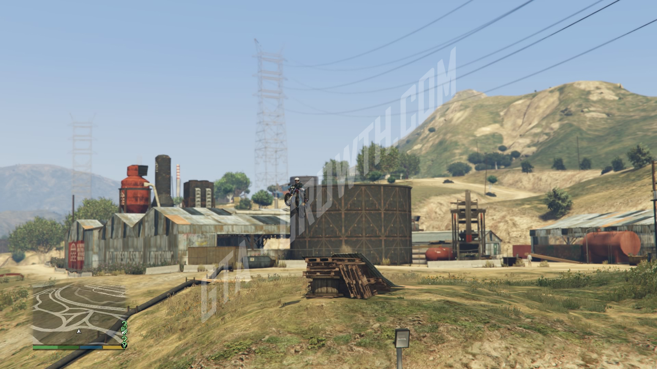 12. La rampa está formada por un gran trozo de concreto perteneciente a la pared donde está apoyado en Banning. Identificarás fácilmente esta ubicación si has jugado en la misión de contacto Rompetratos de GTA Online. Si comienzas a tomar carrera desde debajo del puente deberías alcanzar la velocidad necesaria para llegar al otro lado del canal. El objetivo es caer entre el gran silo de la izquierda y el silo de menor tamaño del centro. |