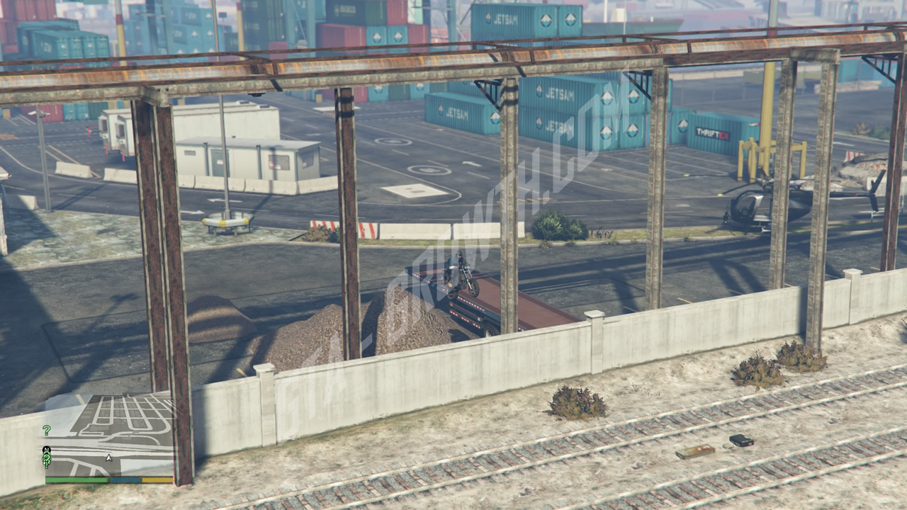 8. Comienza desde el extremo sur de la isla, entre el depósito del oeste y el edificio principal con la leyenda Port of Los Santos. Acelera dirigiéndote hacia el norte en línea recta y aprovecha la habilidad de Franklin para tomar la rampa para caer sobre el tejado del depósito norte, casi al final del mismo (si caes más cerca de la rampa el salto no será considerado válido). |