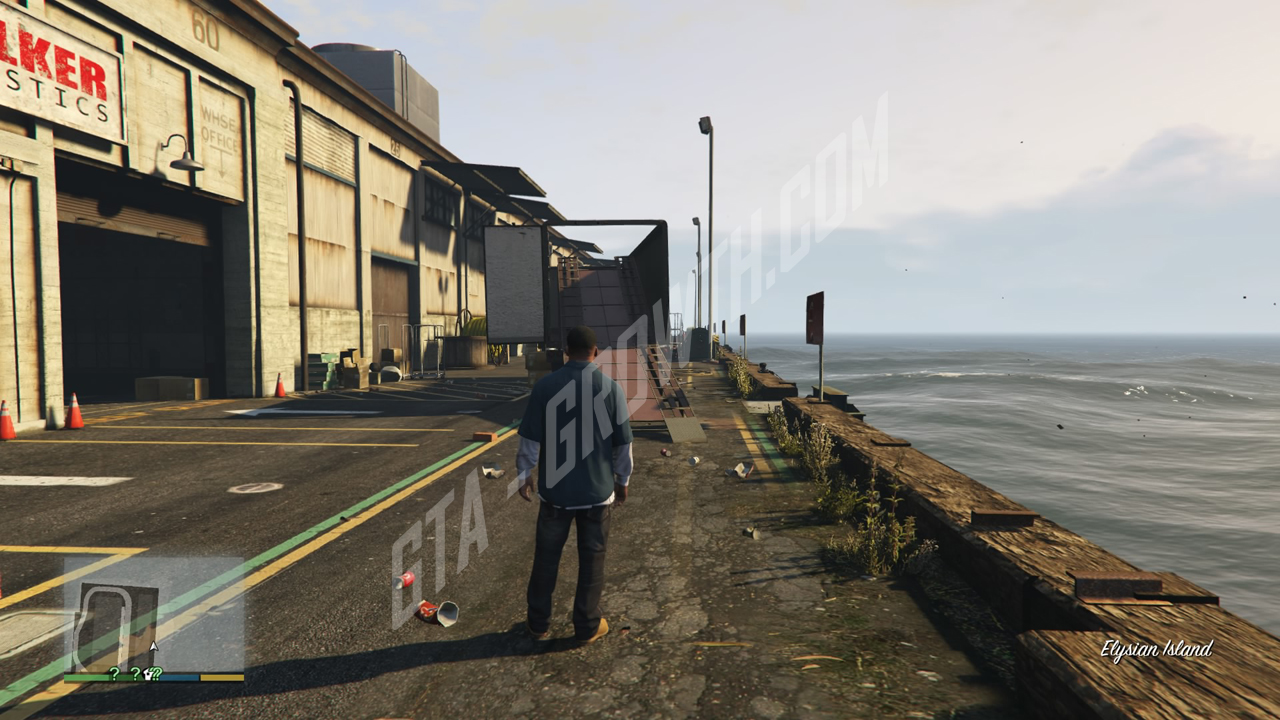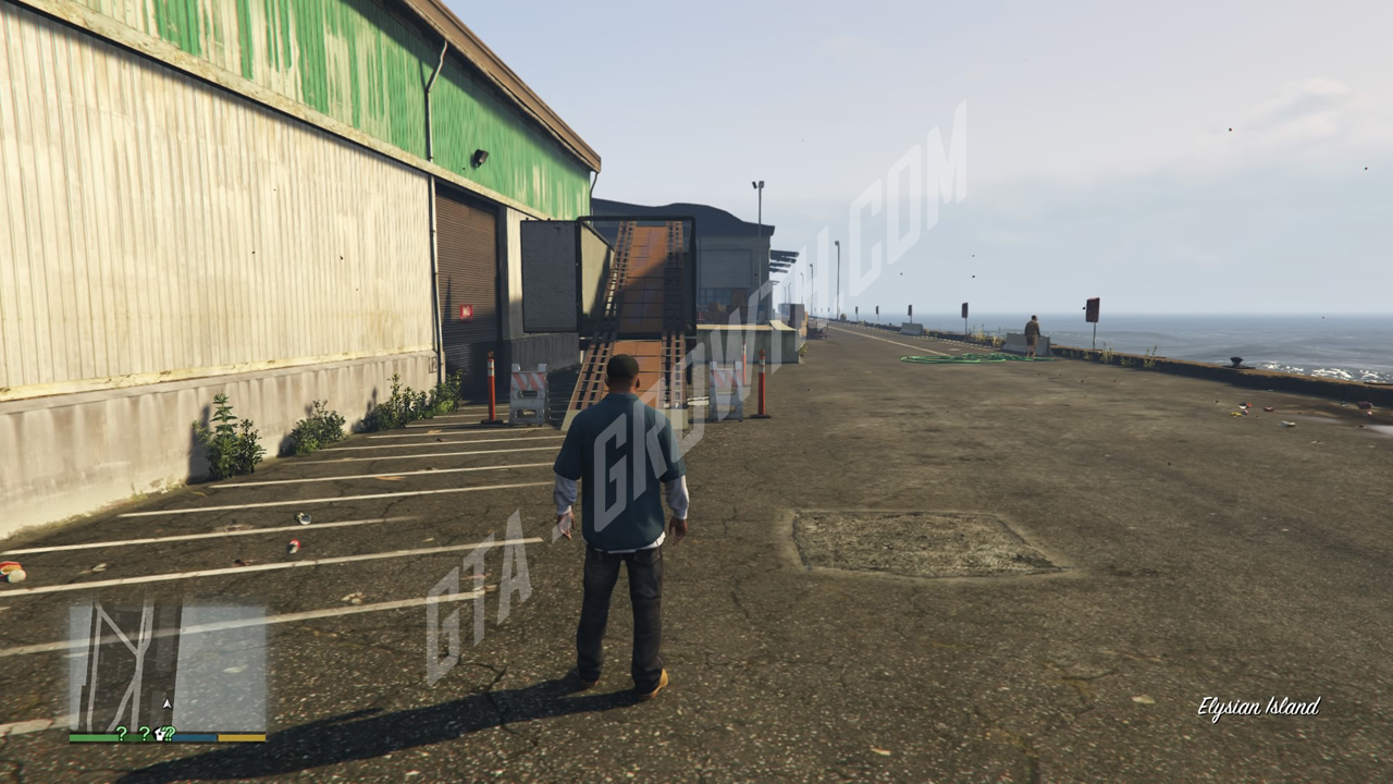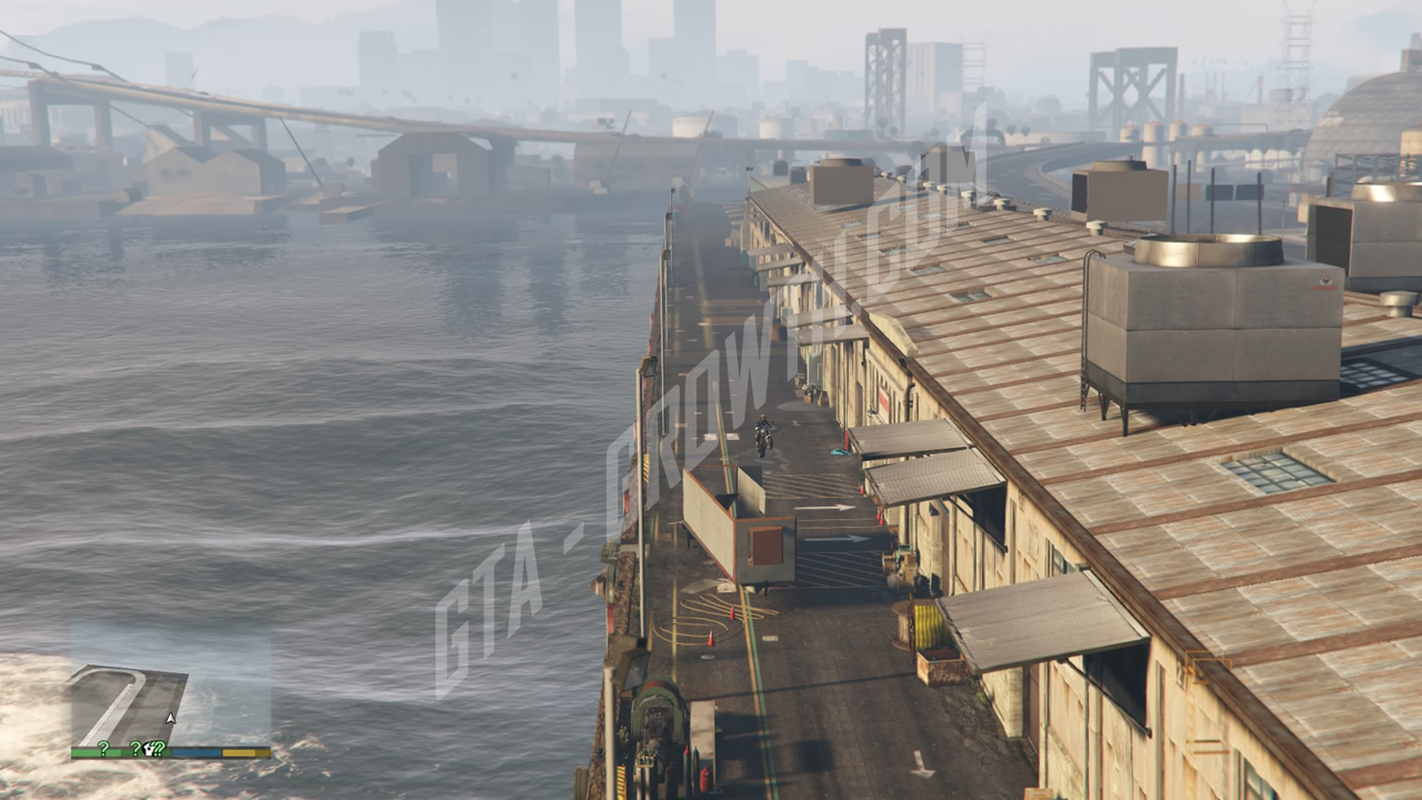 4. Encontrarás otro montículo de rocas pequeñas junto a un tanque de gas al lado del puente más al norte de Elysian Island. Colócate aproximadamente en el centro del estacionamiento y salta en dirección al este para caer sobre el puente. Es importante que no tomes demasiada carrera y que apuntes en dirección al este, lo más paralelo al puente posible. En caso contrario, podrías terminar cayendo al agua al otro lado del puente. |
