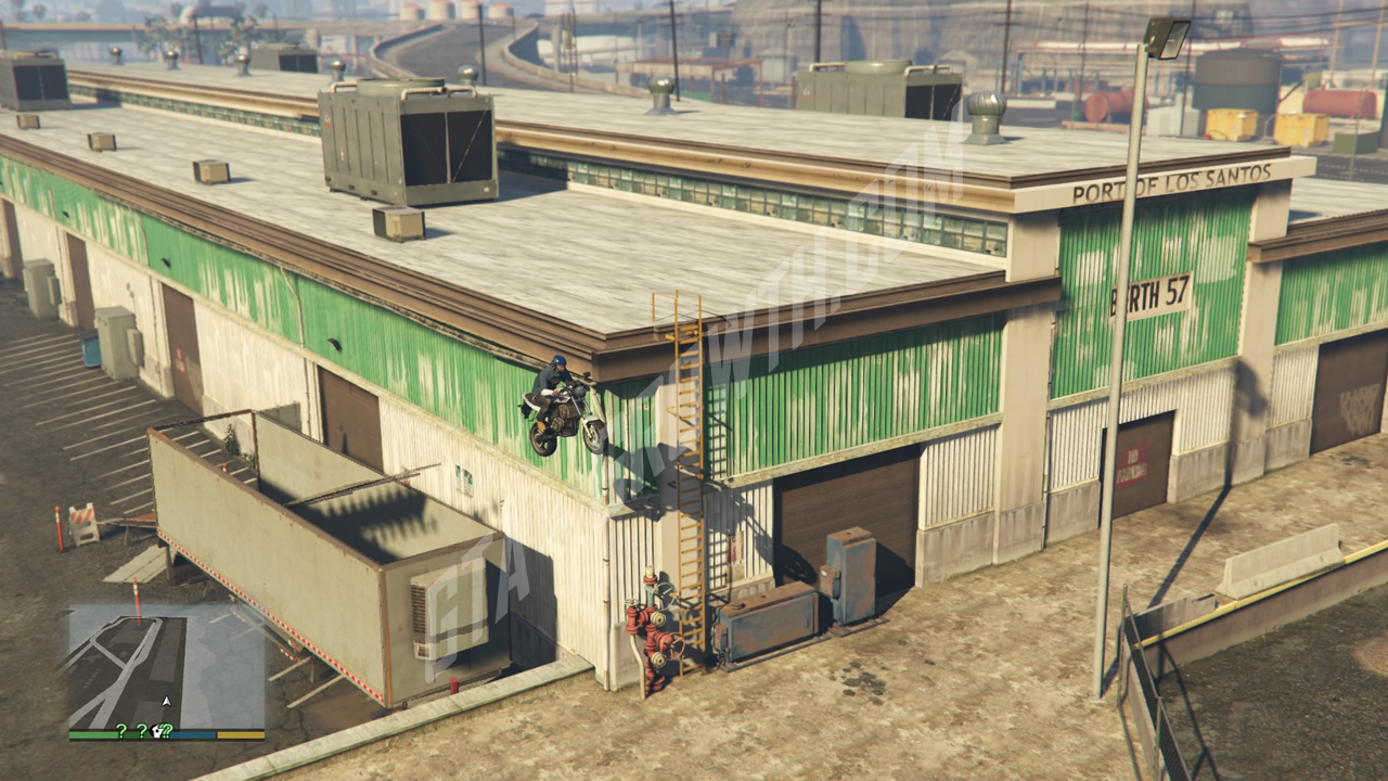 10. Nuevamente deberás utilizar una rampa dentro de un tráiler y saltar al tejado del depósito. En este caso, puedes comenzar desde la esquina noroeste del depósito en cuestión. No olvides que la habilidad de Franklin te facilitará mucho la tarea de dirigir el vehículo levemente hacia la izquierda para caer en el tejado. |