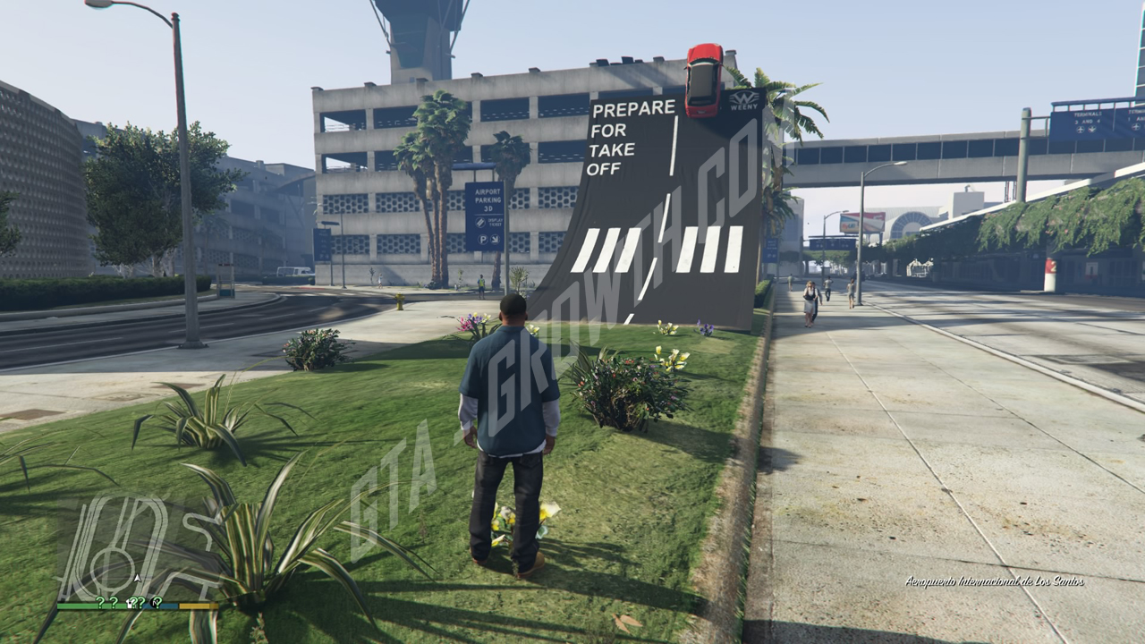 13. Si has jugado GTA Online seguramente habrás utilizado muchas veces esta rampa para acceder al aeropuerto. Se trata de un contenedor de basura junto a los carteles de Air Herler y MyFly. Tienes espacio de sobra para acelerar, pero con hacerlo desde la entrada al estacionamiento central que tiene un gran número 2 de color amarillo debería ser suficiente. Si no has adquirido la propiedad Hangar Internacional de Los Santos la policía comenzará a perseguirte tras caer sobre el perímetro del aeropuerto, pero puedes ocultarte en el estacionamiento antes mencionado para perder el nivel de búsqueda. |