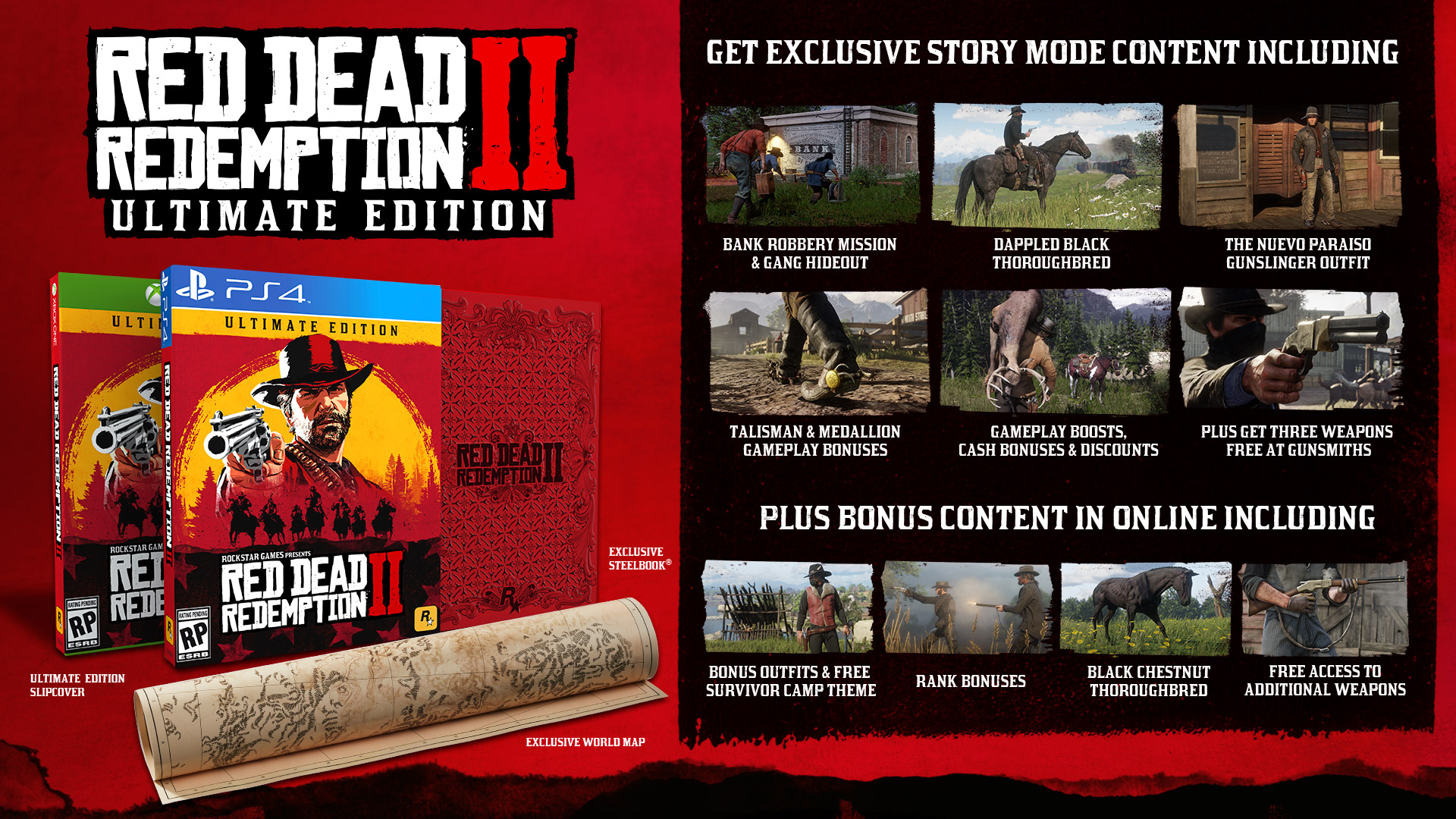 Hoy tenemos el placer de anunciar los detalles de la Edición Especial y la Edición Definitiva de Red Dead Redemption 2, así como las bonificaciones adicionales por reservar cualquiera de las tres versiones y una serie de coleccionables exclusivos del mundo real inspirados en el juego.