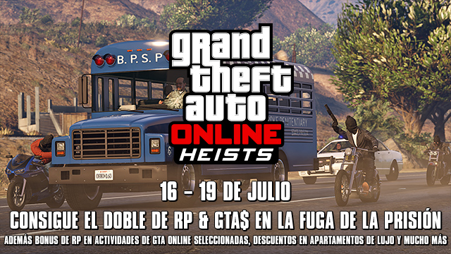 Durante el resto de esta semana, la recompensa ofrecida por el Agente 14 a cambio de rescatar al profesor Maxim Rashkovsky de la penitenciaría Bolingbroke será doble. Esta bonificación ya se encuentra habilitada y permanecerá vigente hasta el domingo 19 de julio. Cabe destacar que la bonificación aplica tanto para los puntos de reputación (RP) como para el dinero del juego (GTA$).